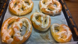 Kovászos perec -3 dl tej ben el lett mosva 15 dkg kovász és lett adva hozzá 20 dkg fehér liszt mikor meg kelt ment hozzá még 5 evőkanál olaj és egy kanál sertés zsír és fehér liszt kb 40 dkg és annyi víz hogy az állaga jó legyen + só + liszt félfogós szórásnak – Át lett dolgozva alaposan és 25-30 percig kelt melegen és utána alapos dagasztás és és ki nyújtottam 1,5 cm es és le lett vastagra vágva és kb 60 cm es re körkörösen a tésztából és ebből lett 80 cm es 1,5 ujnyi széles tészta lett megformázva . Tepsire raktam és a sütőbe kelesztettem langyos sütőbe . megkentem és 230 c os sütőbe sütöttem míg a színe majdnem ilyen lett és 15 perc után 200 C -akkor kapta a só liszt víz keveréket és azt megint rá szikkasztottam . De lehet rá magokat is szórni . de bármelyik élesztős recept át alakítható ha liszthez viszonyítva adunk 15-20 % kovászt